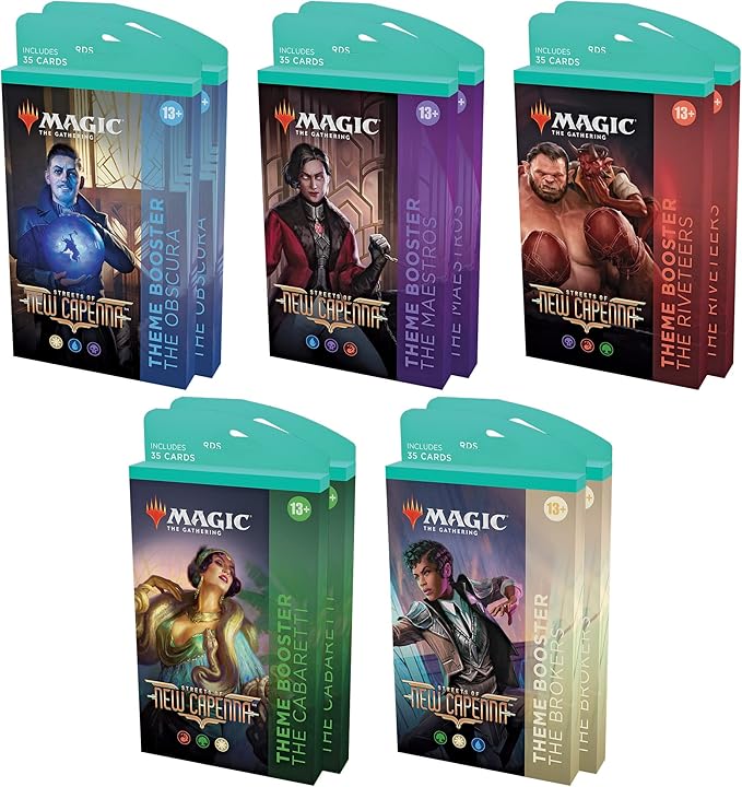 Cada una de las cinco familias que compiten por la fuerza y las ganancias en New Capenna toma más de uno o dos colores Este anuncio es para una caja sellada de 10 paquetes de refuerzo temáticos, cada paquete tiene 35 tarjetas.